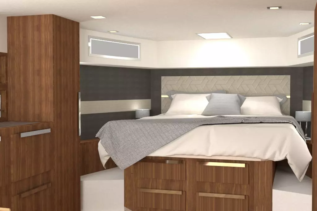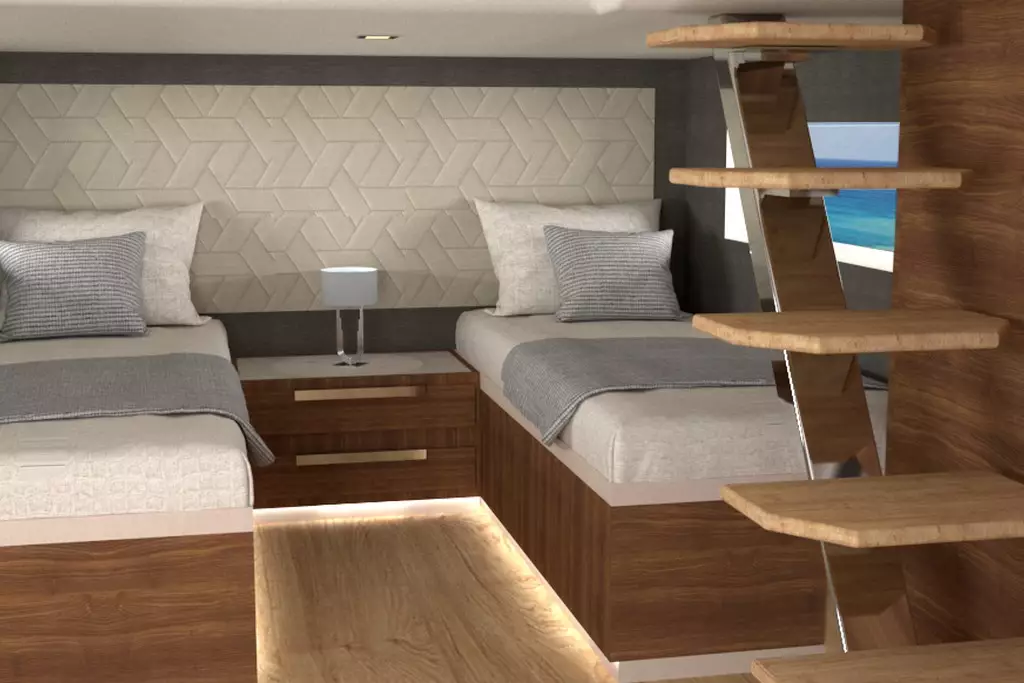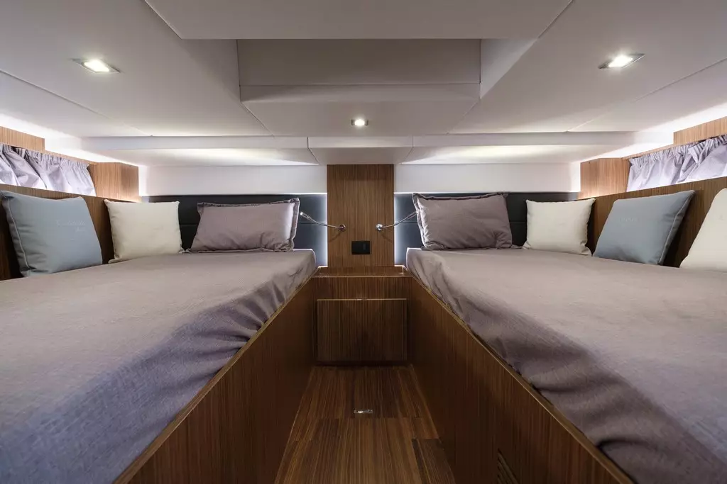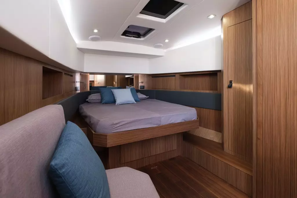 Below deck features a double berth plus a full bathroom; a second double berth is available as an option.