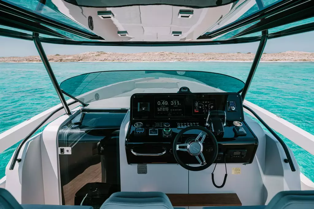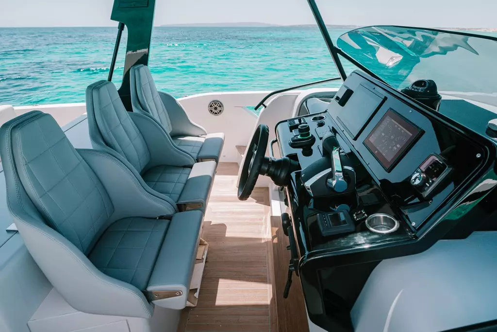 The bow features a fantastic seating area and the large elevated sundeck topped by the cockpit roof is perfect for entertaining. The large dashboard accommodates twin screens and a host of controls ready to suit any captain.