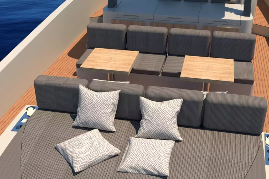 Because of the clever design and walk around features, the bow has seating for a large group and grand sunbathing bed space. Further back the dining space and fully equipped outdoor kitchen caters to all needs and with the huge sunbed covering the outboard engines (or IPS) there is plenty of room to relax.